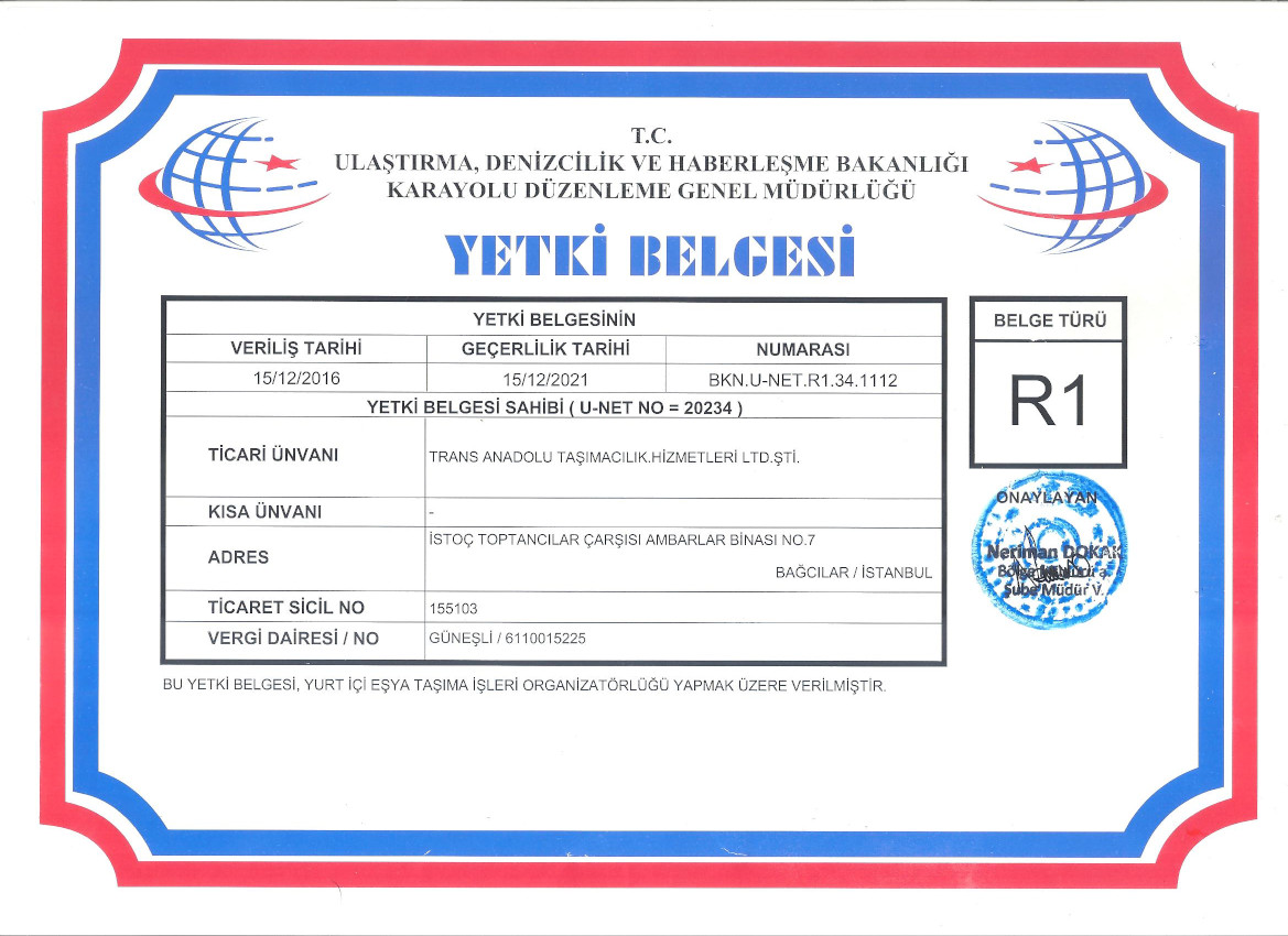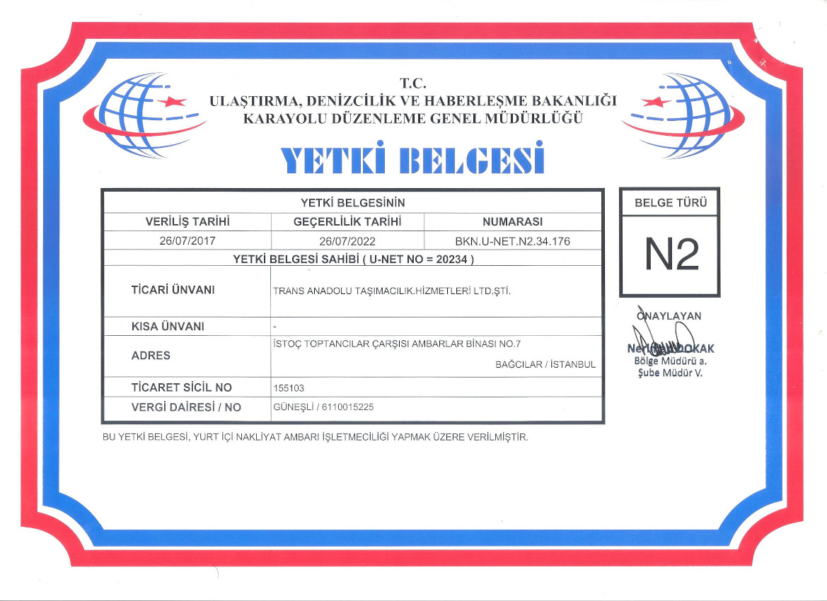 Trans Anadolu Lojistik olarak, sektördeki yetkinliğimizi ve güvenilirliğimizi gösteren resmi yetki belgelerine sahibiz. T.C. Ulaştırma, Denizcilik ve Haberleşme Bakanlığı tarafından verilen bu belgeler, karayolu taşımacılığı ve tehlikeli madde taşımacılığı alanlarında müşterilerimize sunduğumuz hizmetlerin kalitesini ve yasal uygunluğunu teyit etmektedir.